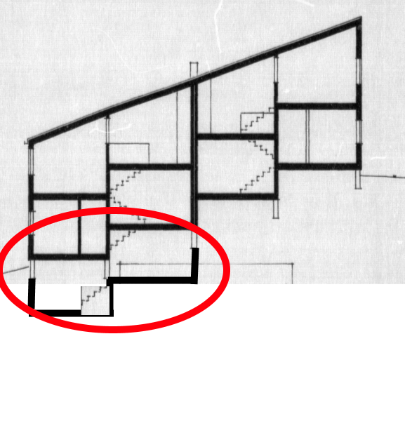 Tverrsnitt av tomannsboligen (rød ring viser nye etasjer)