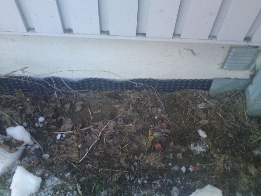 Vi ser også at grunnmursplasten(knotteplast) stikker ca 10-15 cm opp over jorda. Denne er ikke lagt inntil med klemlister.