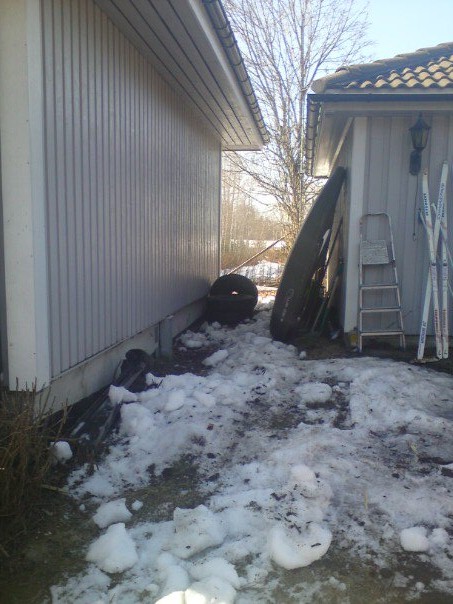 Vannet tørker nå sakte men sikkert bort inne,men vi har ikke revet veggen for å se hvordan det ser ut bak denne (fiber/sponplater).