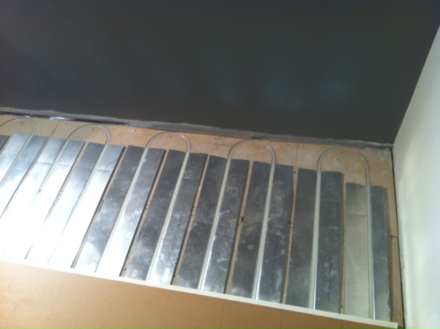 Tok forøvrig et bilde av vannrøret lagt ned i sporene på sponplaten. Som dere kan se vil en eventuell avrettingsmasse ikke kunne trenge ned på undersiden av røret, så varmeledningsevnen vil jo bli begrenset...