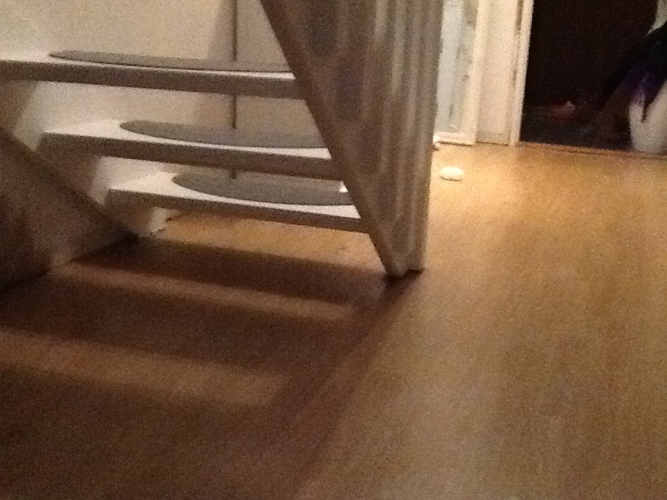 Helst skulle jeg prøvd å fått parketten som tidligere er lagt i tilstøtende kjøkken til å passe, men da har jeg ikke muligheten til å få avpasset det slik at trappeavsatsen kommer akkurat i en skjøt....