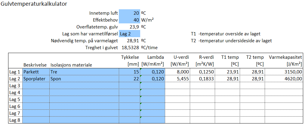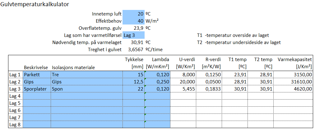 Som du ser at med gips må du ha 31ºC turtemp kontra 29ºC uten gips forutsatt 40 W/m² og 20ºC lufttemp.