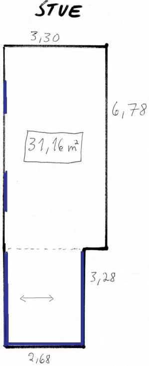 Stua er veldig smal og har et tilbygg på enden der gulvet er ca 5 cm lavere enn resten av rommet. I tilbygget vil retningen uansett bli som pilen viser på skissen grunnet tynne gulvplater pga høydebegrensning (parkett må ligge på tvers av bjelkelaget)