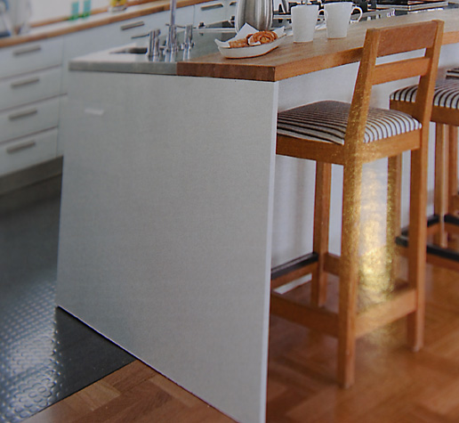 Eg blir ikkje enig med meg sjølv om kva golv vi skal ha på kjøkkenet. Det er på over 30 kvadrat, og med spisebord, så det er naturlig å ha parkett. Eg vurderer å ha noko anna i arbeidssonen, nærmare bestemt gummigolv. Då er eg usikker på korleis skjøyten mellom dei to golvtypane blir. Ønsker ikkje metallist. Helst ikkje list i det heile tatt. Kan det la seg gjere? ??? Eller blir det berre ein smulesamlar?