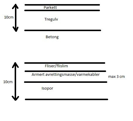 Fra toppen av parketten ned til betongen er det omtrent 10cm. Gniten som jeg er, så ønsker jeg å rive vekk alt og bygge mest mulig med isopor, og bruke armert avrettingsmasse som grunnlag før flisene. Det jeg lurer på, er om isoporen blir for bevegelig? Jeg vil, som dere sikkert forstår, unngå å støpe om det er mulig. Kan det være nok å gjøre slik som jeg har illustrert på tegning, eller vil det være bedre om jeg stiver av på isoporen med gulvgips eller noe slikt?
