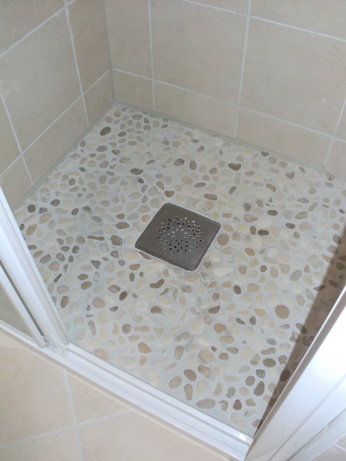 pusset opp badet for noen måneder tilbake å fliste gulvet i dusjen med rullestein (noe sånn som dette).JPG. Men dette gikk ikke helt som planlagt å jeg har nå fått noen plasser der det samler seg vann.