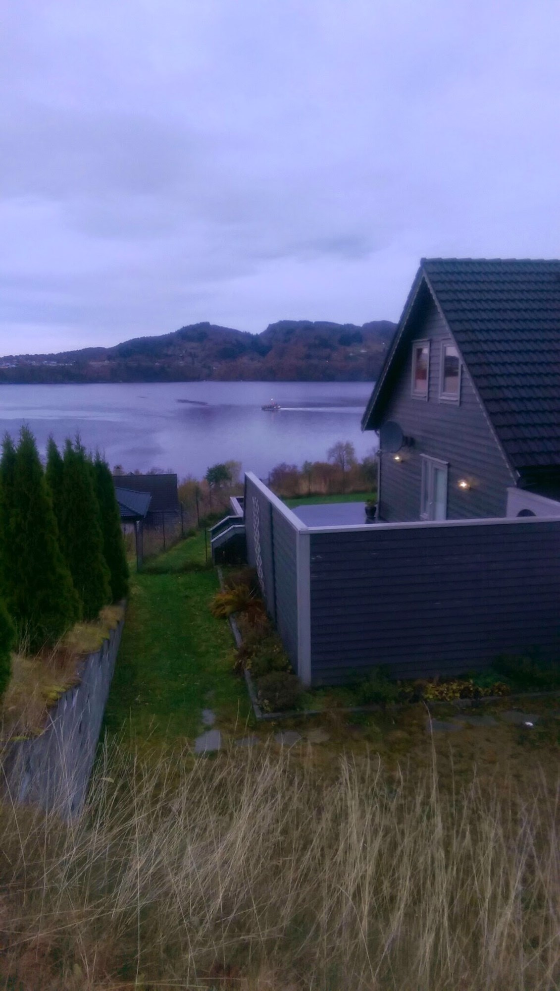 Det er fremme fra og litt fra venstre i bildet som den verste vinden kommer inn (45 - 70 grader fra venstre i bildet tenker eg) , og vinden blir fanget av hushjørnet som du seier. Vi har snakket om noke leplantning på den siden. Men det tar jo gjerne noken år før det gror skikkelig til..