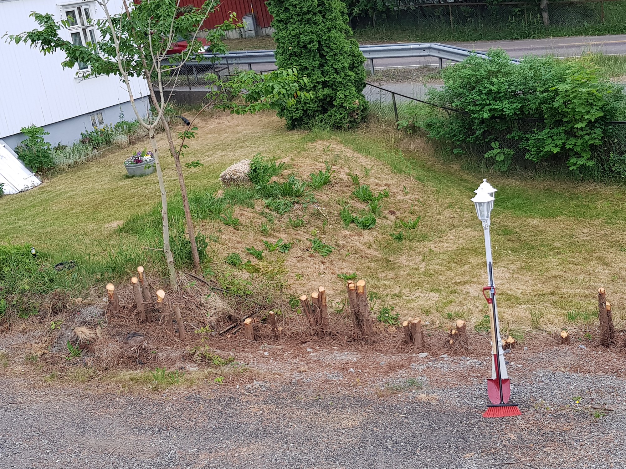Vi har nettopp hugget ned XX antall tujaer (skal kutte ned enda mer enn på bildene under).