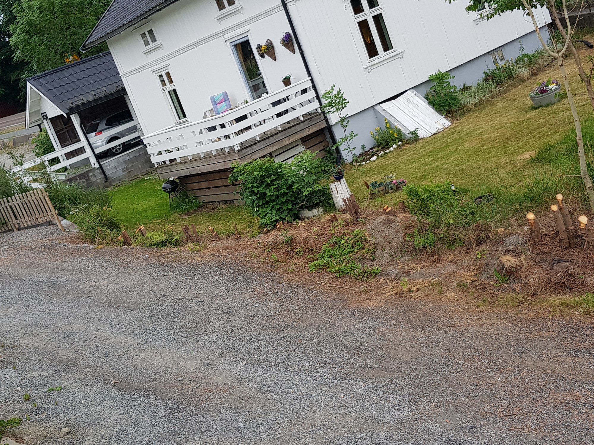 Vi sliter virkelig med å finne en løsning for hvordan vi skal skille vår tomt fra naboens. Tomtegrensen går ca. der hvor tujaene er. Som dere ser er det høydeforskjeller mellom tomtene, og jeg tror det er ganske mye røtter under jorden. Vi kunne tenkt oss gjerde, men er usikker på hvor fint det blir med høydeforskjellen. Vi har også vært innepå tanken med en støttemur, men grunnet delvis stramt budsjett på dette er vi usikre. Tips til hva dere ville gjort?