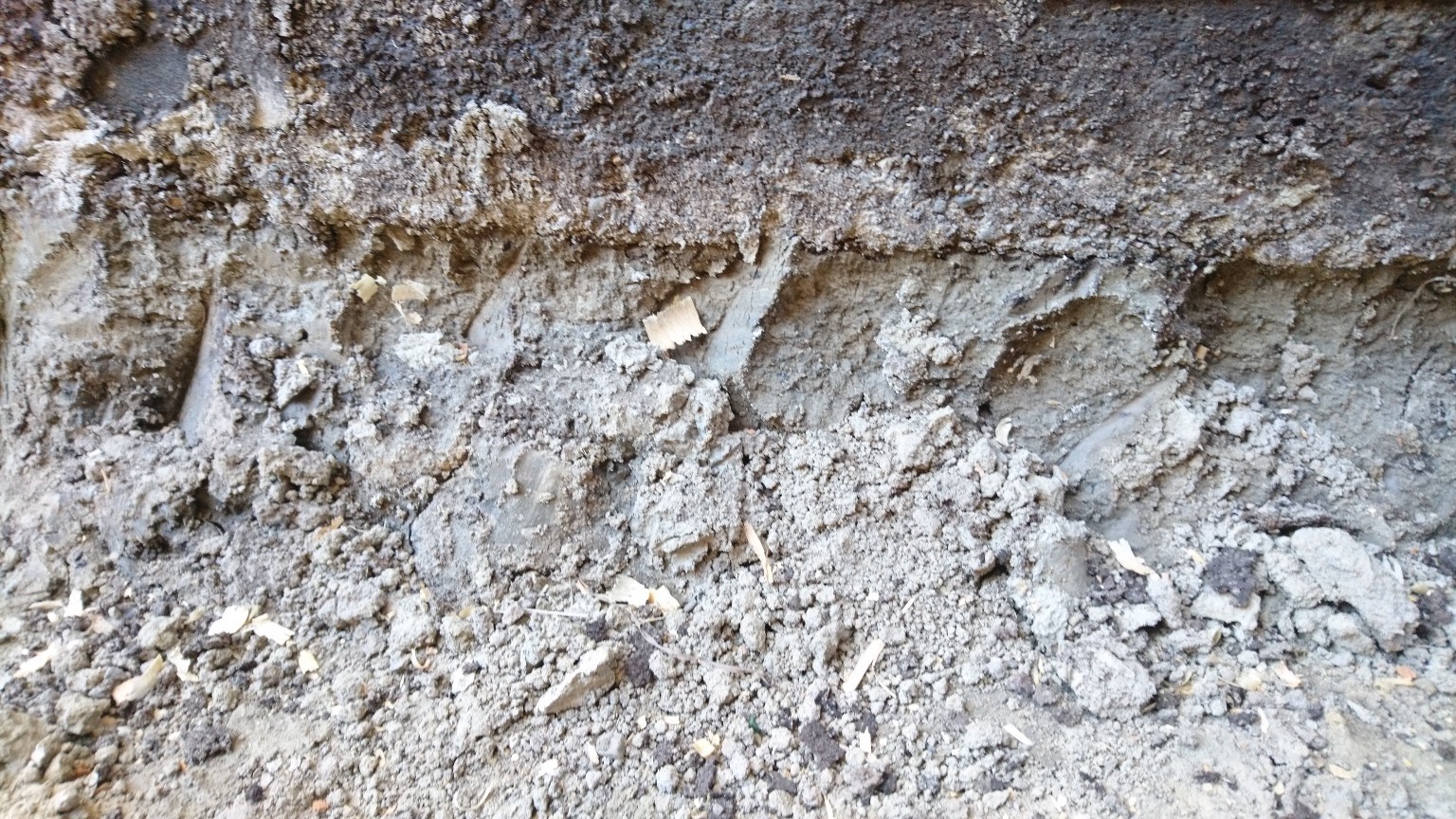 Nærbilde av bunn av sålen. Som dere ser så er det leire rett under.