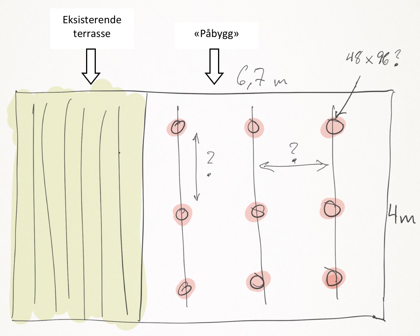 Her kommer nok et spørsmål om terrassebygging, men føler at det er innafor gi og med at jeg har en liten vri: Har en hageflekk på ca. 45 kvm hvor det i dag ligger markterrasse i ca halve hagen. Lei av at gressklipperen tar plass når det kun er snakk om 25 kvm gress som skal klippes. For så vidt lei av gressklipping også... Lefler nå med tanken om å skjøte på og bygge terrasse i hele hagen. Ønsker selvfølgelig at denne skal flukte med eksisterende terrasse.