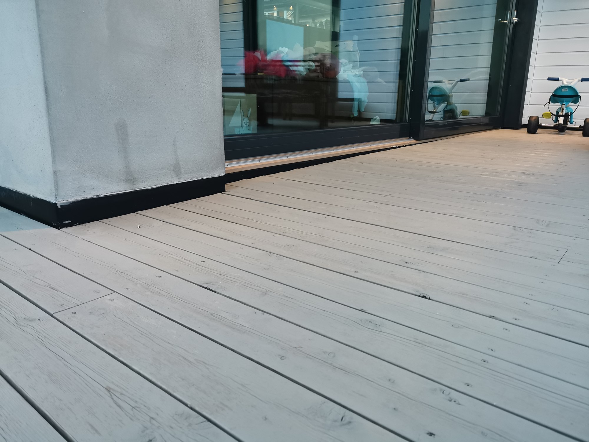 Har sveist vinkelen selv ja, men har sett at de er å få kjøpt ferdige. Jeg sveiste vinkelen noe under 90° for å kompansere for fallet slik at rekkverket stå i lodd. Har brukt 2*x 6* uten kile så hele terrassen ligger altså også med fall (se bilde). Var på tanken å rette opp terassen, men valgte å droppe det. Det har aldri plaget meg at det ser skjevt ut. Det har jo en logisk forklaring og gjort med vitende vilje🤪