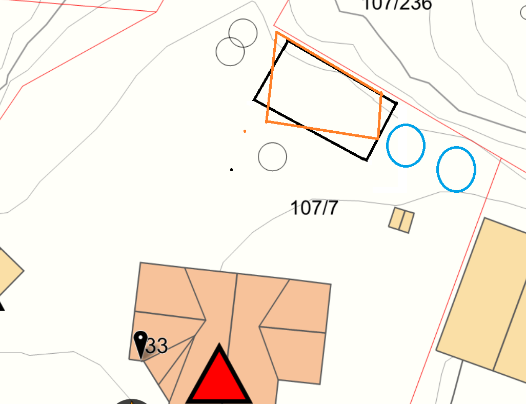 Planlegger utegulv i hagen. Bildet under viser to forslag til plassering av utegulvet, en sort rektangel (7x3,5m) med utegulvet på linje med tomtegrensen (skråning), og en oransje variant med utegulvet på linje med huset. De blå ringene er trampoline og basseng.