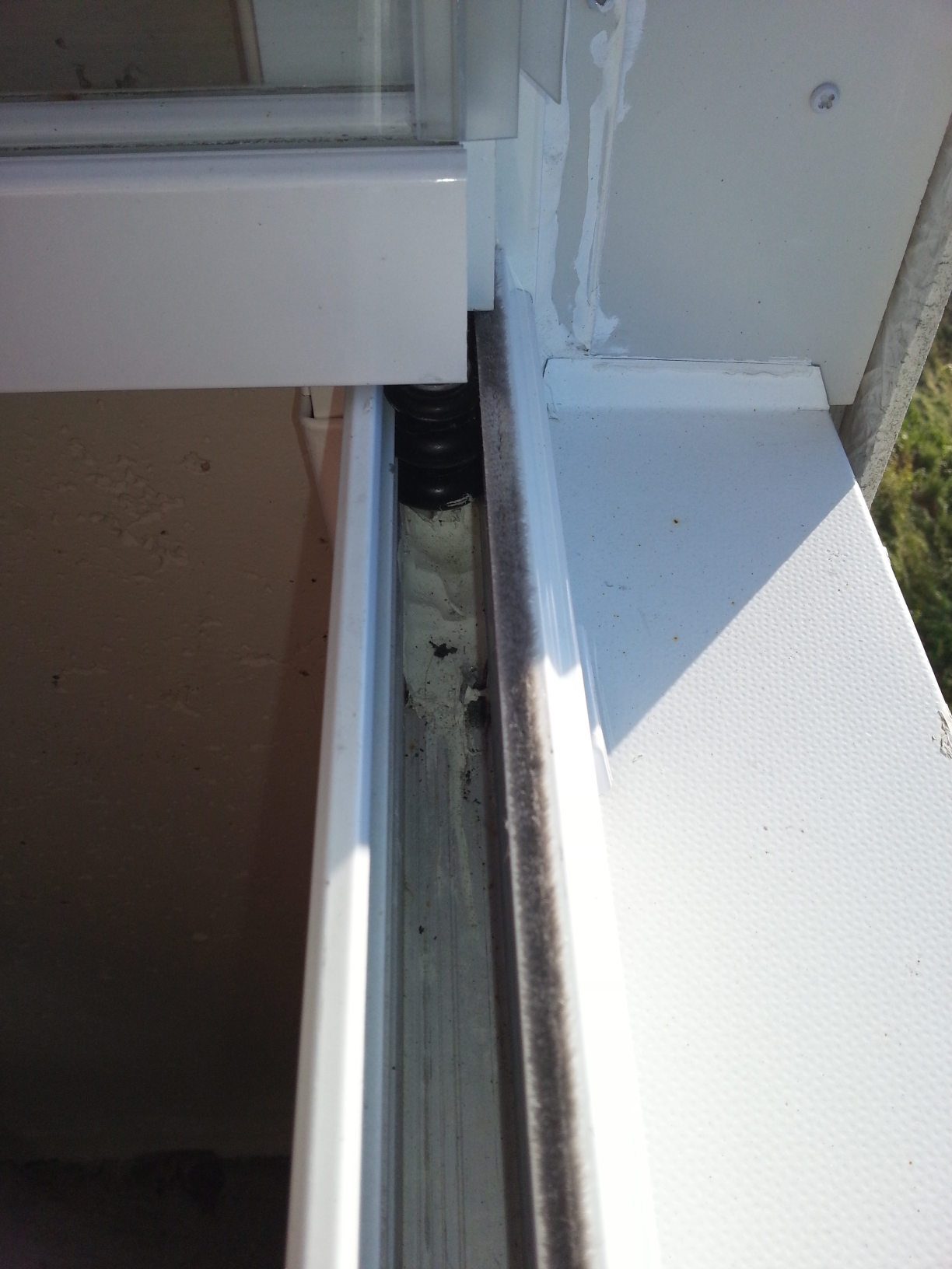 Jeg har en innglassing som vist på bildene. Problemet er lekkasje midt på den nederste horisontale aluminiumsprofilen som glassene ruller i.