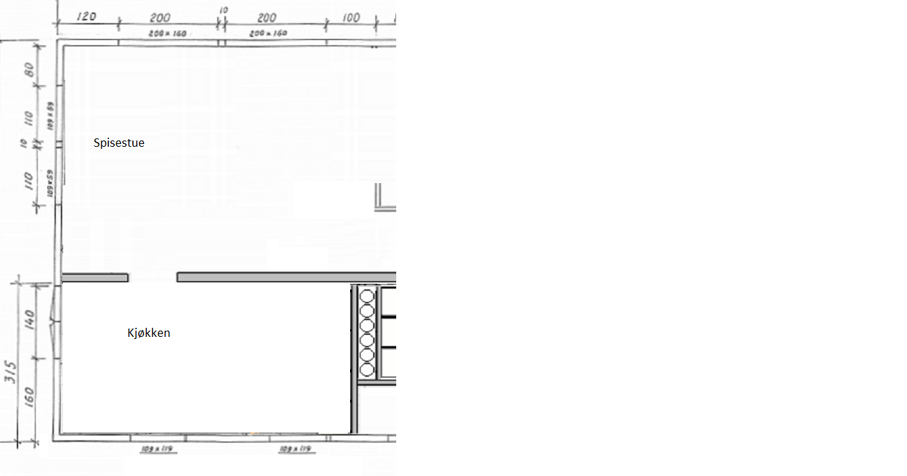 Utgangspunktet når det gamle kjøkkenet er tatt ned og en dør lukket er slik som bildet. Langveggen kan helt eller delvis fjernes. Vinduer kan flyttes på.