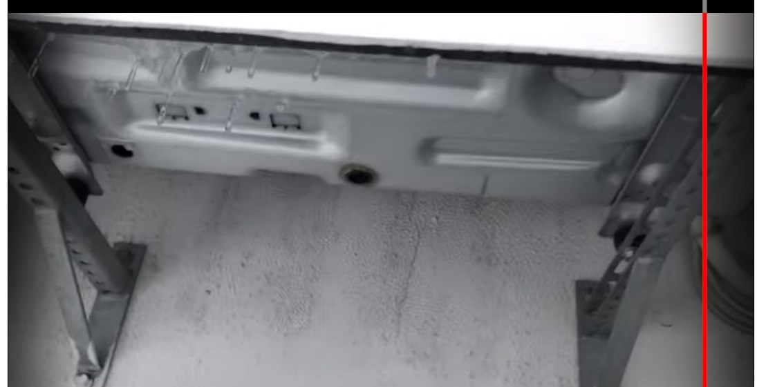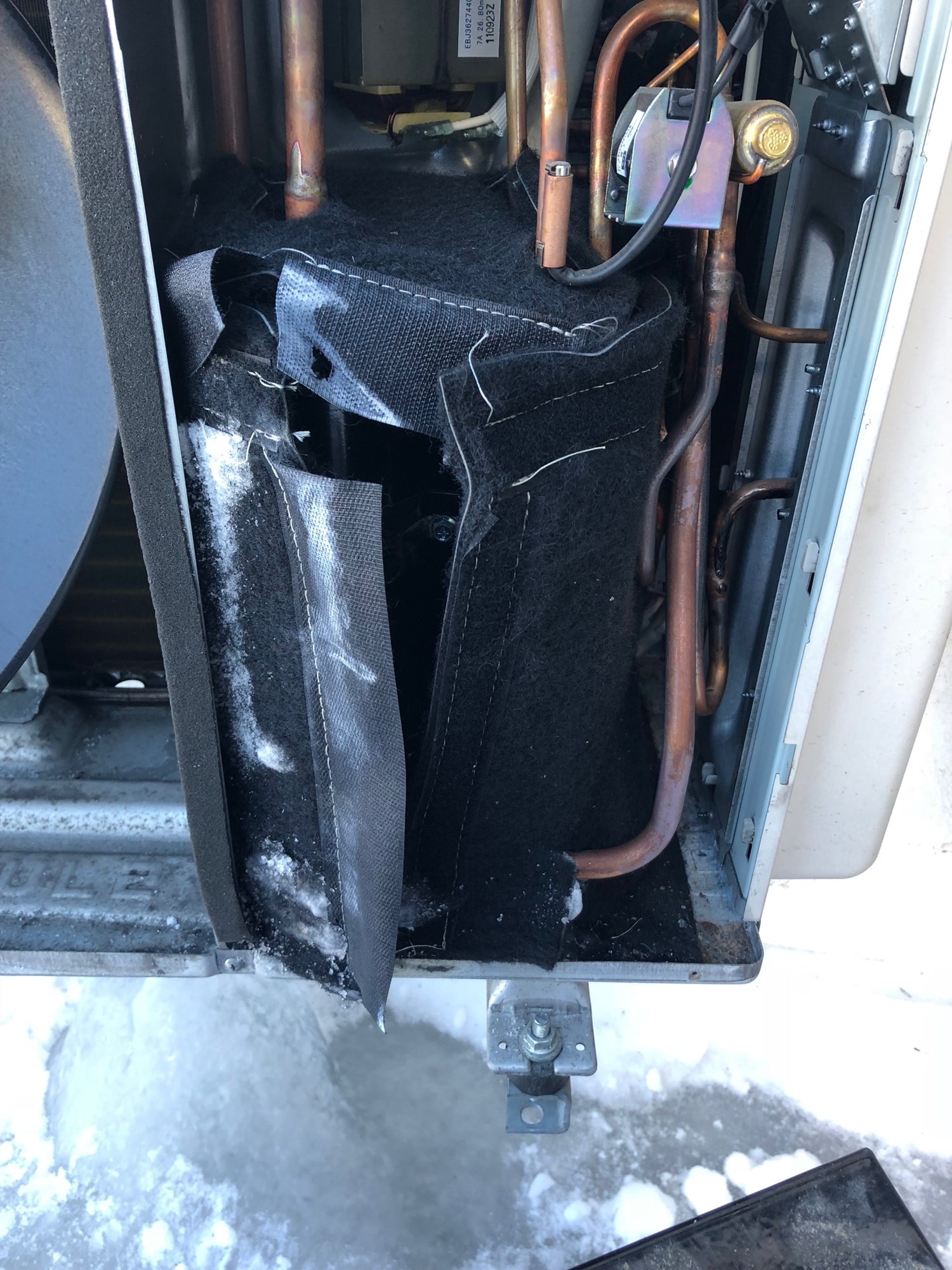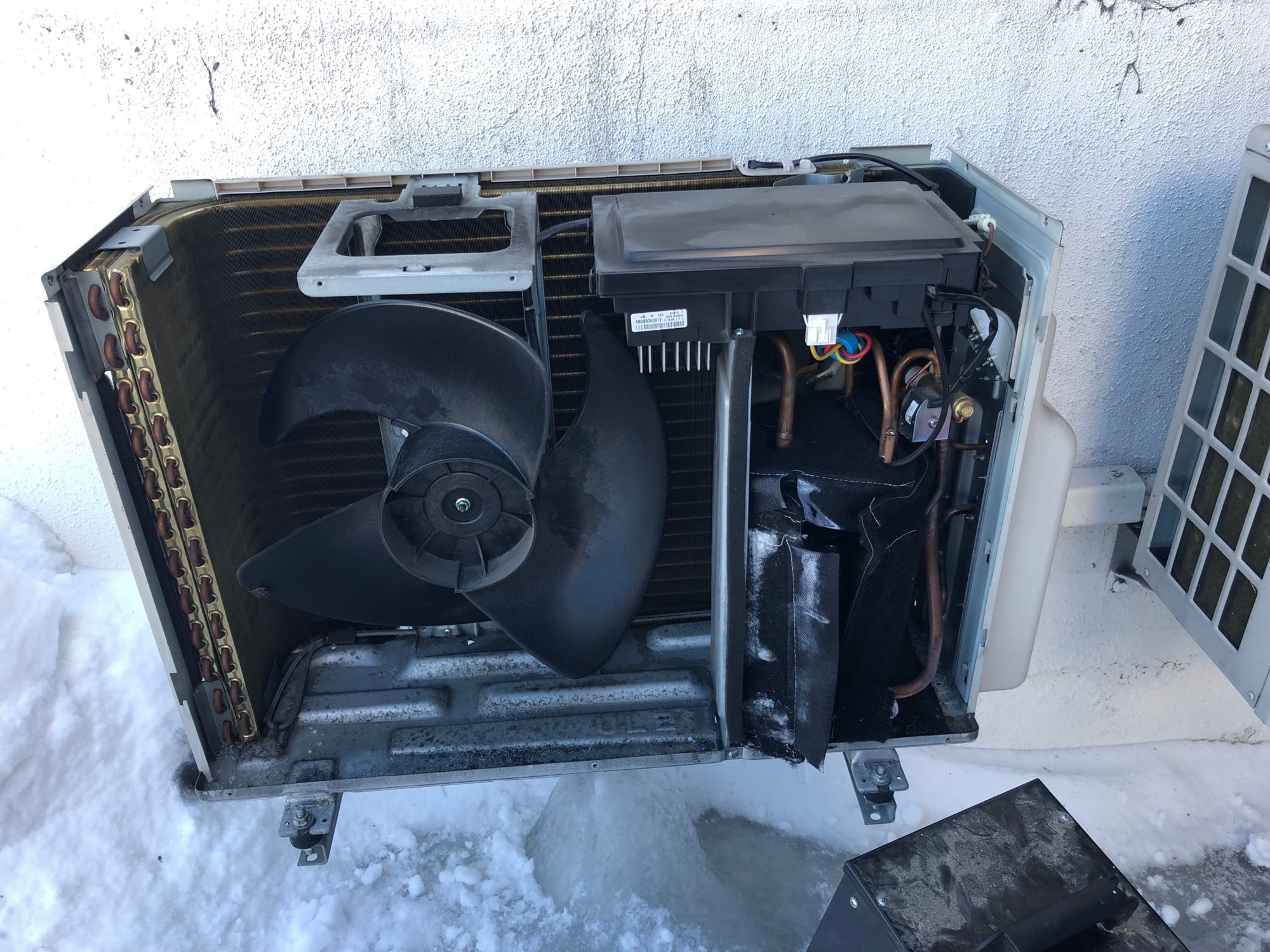 Det som er skjedd er at pumpen satt seg litt og lener seg litt fremover/utover. Da varmekablene er i bakkant mot veggen, så renner det vann på bunnplaten fremover mot fronten på pumpen. Der sitter kompressoren og den er pakket inn i isolering. Vannet har da blitt til is rundt hele kompressoren og inni isolasjonen. Dette har ført til at kompressoren blitt et med chassi til hele pumpen. Så når kompressoren durer, så durer hele pumpen.