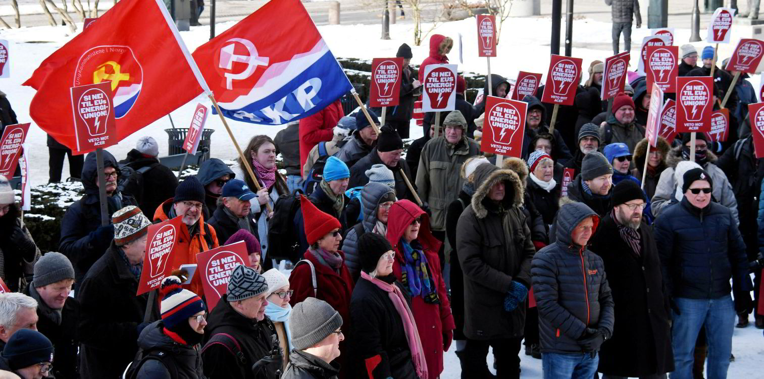 – Bidrar til mer velfungerende markeder Superkort oppsummert foreslår regjeringen at Stortinget innlemmer fire EU-forordninger i norsk lov. Disse ble vedtatt i EU allerede i 2009, og er altså en del av tredje energimarkedspakke. – Formålet med forordningene er å legge til rette for mer effektiv krafthandel over landegrensene, skriver regjeringen. Komitéinnstillingene viser at stortingsflertallet gir regjeringen full støtte. Tatt i betraktning av hvor omstridt Acer-saken var, er formuleringene fra flertallet lite diplomatiske. Det er uforbeholden støtte til å knytte Norge nærmere EU: – Innlemmelsen forventes samlet å gi bedre forsyningssikkerhet, å legge til rette for bedre integrering av fornybar energi i kraftsystemet og å bidra til mer velfungerende markeder og effektiv nettvirksomhet. Dette er til nytte for produsenter, forbrukere og andre virksomheter og aktører i Norge, skriver flertallet som består av regjeringspartiene, Ap og MDG. De fem partiene skriver imidlertid ingenting om hvorfor innlemmelsen vil gi «mer velfungerende markeder . I praksis har jo Norge tilpasset seg alle EU-regler allerede. I 2018 var det massive protester imot EU-forordningene som nå blir godkjent av Stortinget helt uten demonstrasjoner. Foto: Haakon Barstad – Vanskelig å vite konsekvensene Sp og SV går ikke overraskende imot å innlemme EU-forordningene. Ikke fordi de har noe konkret å peke på, men fordi de ikke har oversikt: – Denne proposisjonen kom svært sent fra regjeringen, og at det har vært svært dårlig tid til å behandle saken. Forslaget innebærer en innlemmelse på 260 sider lovtekst i norsk rett, (…) det er vanskelig å direkte overse konsekvensene på norsk kraftmarked og styringen av dette, skriver de to partiene. Sp og SV legger til at akkurat dette var et viktig poeng i Acer-kampen, at man innfører omfattende EU-regler uten å kjenne konsekvensene. – Et av poengene har vært at det er vanskelig å vite konsekvensene for norsk rett og nasjonal styring. Disse medlemmer vil derfor stemme imot innføringen av disse forordningene, skriver de. I salen vil de helt sikkert få støtte av et tredje parti, nemlig enmanns-partiet Rødt som ikke er representert i komiteen. Men hva med Frp, hvordan forholde de seg til disse avanserte sakene? Ikke godt å si, for i motsetning til alle de andre partiene har Frp ikke levert en eneste merknad. Det er dermed åpent hva de vil stemme i salen. Utfallet av voteringen er imidlertid klart. Med Ap sine stemmer får regjeringens forslag flertall, og Stortinget fortsetter dermed innlemmelsen av tredje energimarkedspakke. Helt uten demonstrasjoner.