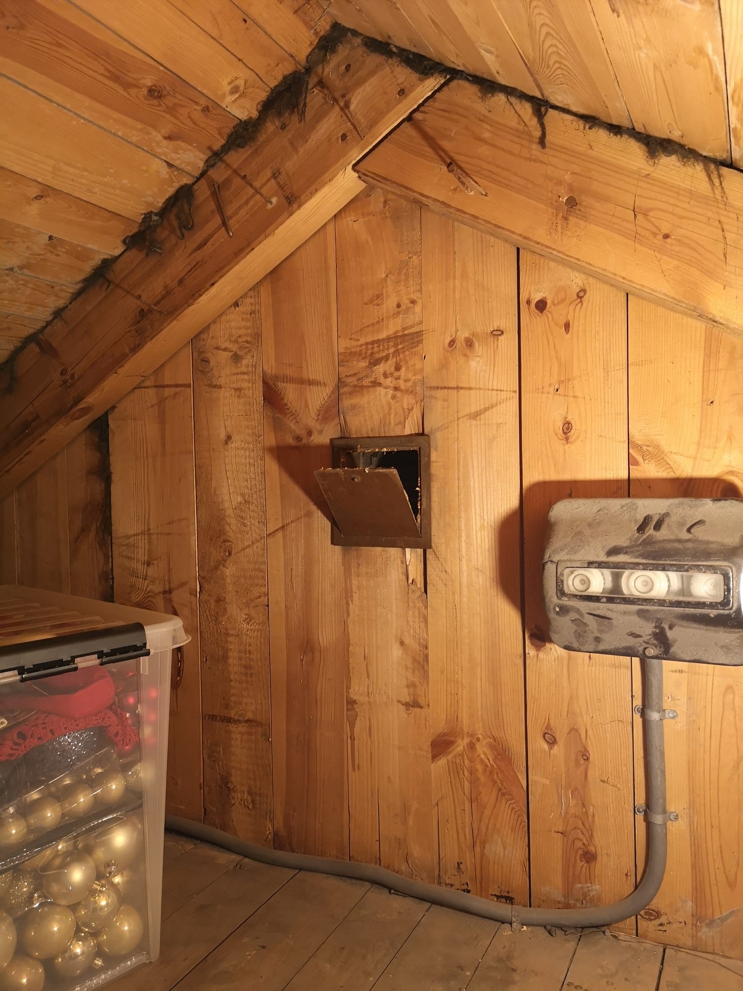 Jeg antar dette kommer av dårlig lufting. Det er én ventil på gavlvegg som har vært lukket i 4+ år (forrige eier sa de ikke hadde vært på loftet, og ventilen var lukket da vi tok over). Huset er vertikaldelt 2-mannsbolig, og det er ikke åpning mot naboens del av loftet.