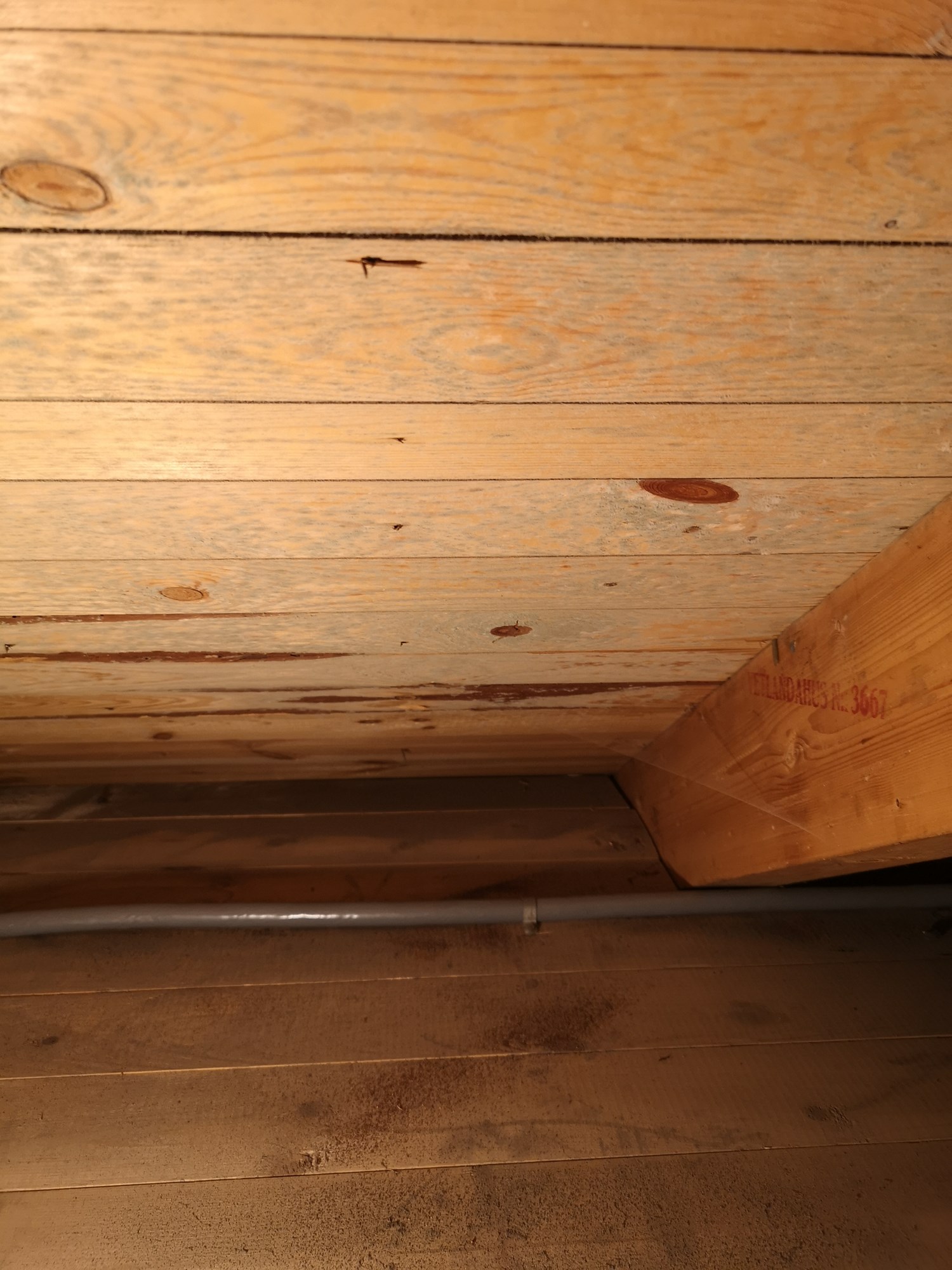 Undertak av gamle trobord? Laughing Huset er fra 1942, men yttertaket ble lagt om fra skiferstein til decra i 1998. Vet ikke om det ble gjort noe med resten av takkonstruksjonen da. Fikk fjernet et par bord innerst, og det ser da ut som at det er lagt inn luftespalte?