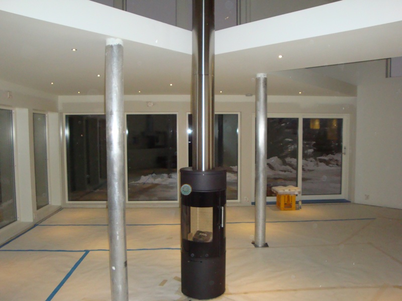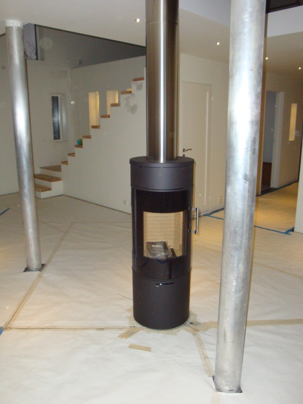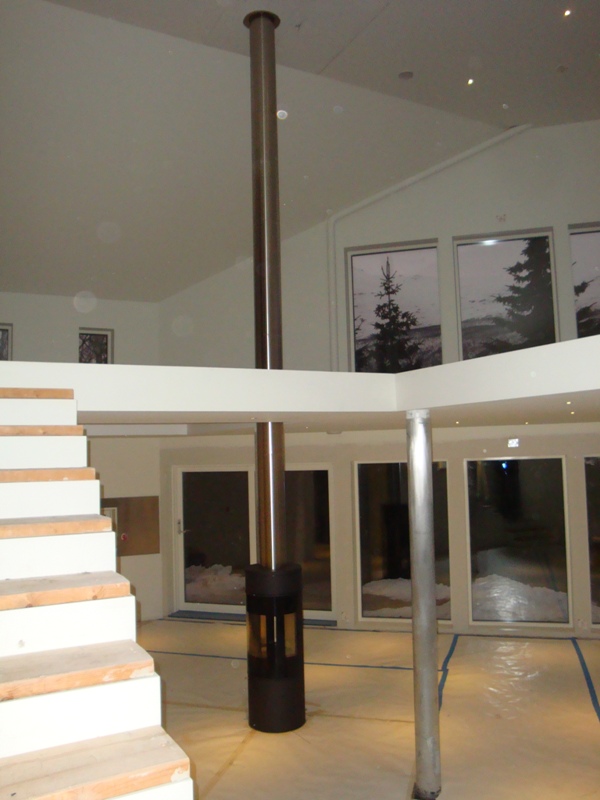 Etter mye leting og synsing ble det en Rais Viva 120, fikk den med sidevinduer siden ovnen skal stå midt i rommet. Den kan dreies 360 grader og kan låses ved hver 45 grader.