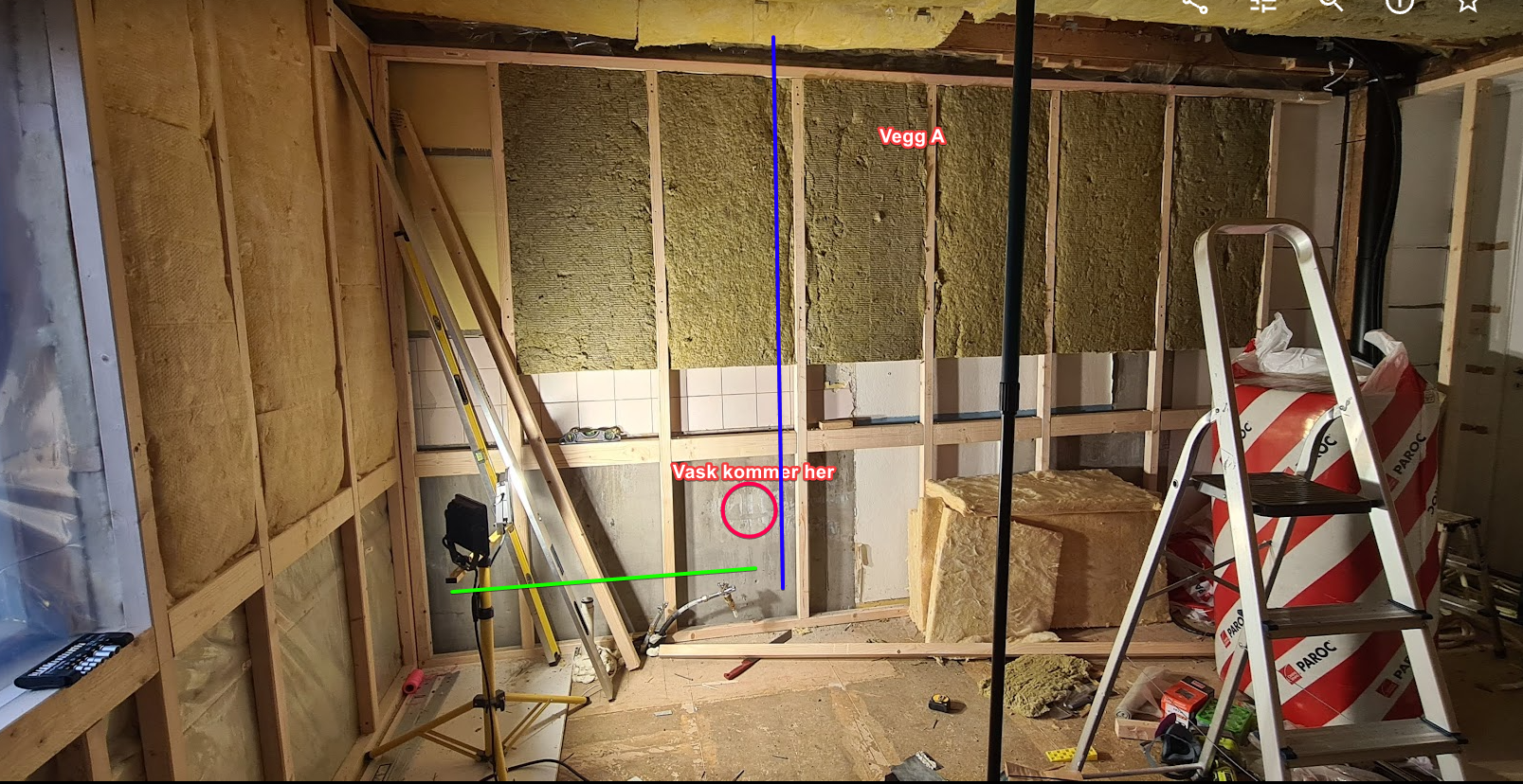 Nå holder jeg på med kjøkkenet, vegger er revet og jeg er godt i gang med å få etterisolert vegger innvendig. Rørlegger vil nå videreføre kaldtvann i fra kjøkkenvasken, la denne ligge i sokkel langs gulvet og så ut igjennom yttervegg for å få på plass utekran.