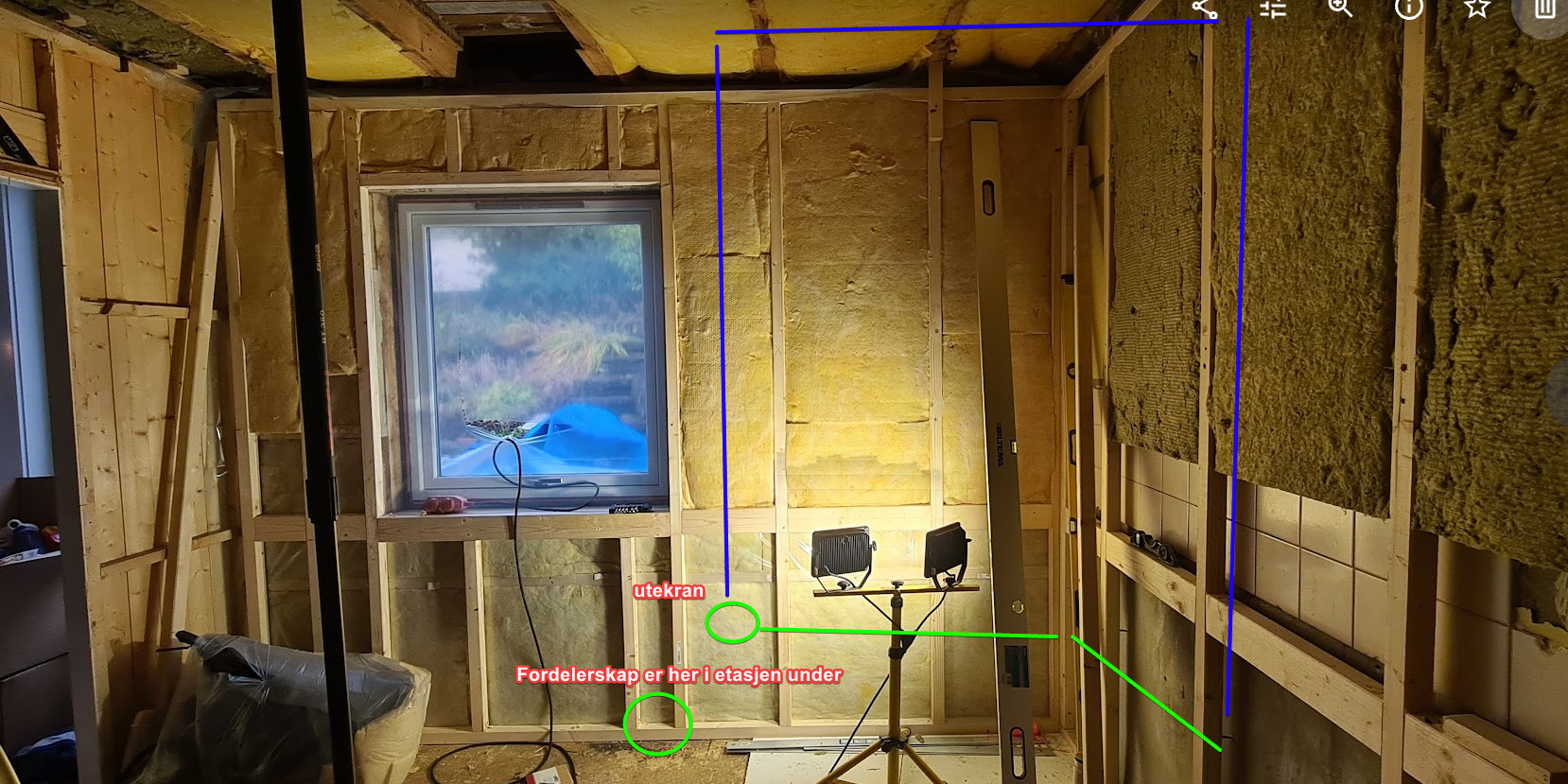 1) Lage hull i gulvet ned i bakkant av hvor fordelerskap er montert igjennom bunnsville på ny yttervegg, så få tak i røret i bakkant av fordelerskap å få en egen kurs til utekran på denne måten.