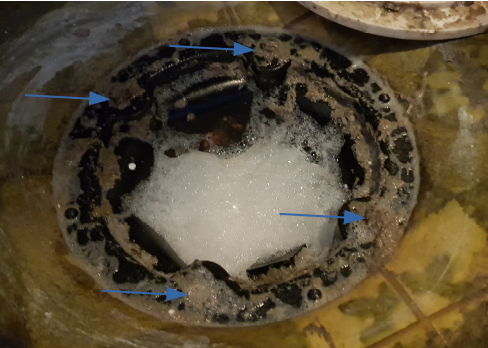 Takk. Renset så godt jeg kunne, men det var vanskelig å få fjernet alt i bunn av skålen. Kompenserte med å kjøre på med Mudin, og skylte ned med en bøtte med varmt vann. Forhåpentligvis er det åpent nok nå.