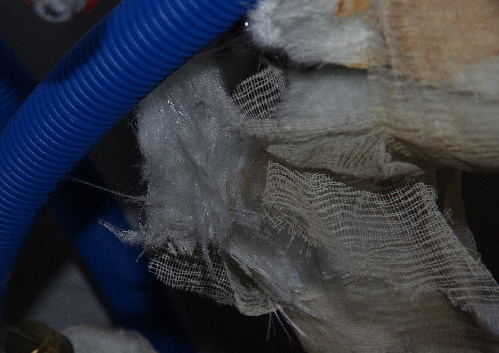 Asbesten er da påsmurt (som en slags sparkelmasse) i bend, på t-rør, in mot kraner, på samlestokker, Kort sakt alle steder det har vært vanskelig å tilpasse isolasjonen.