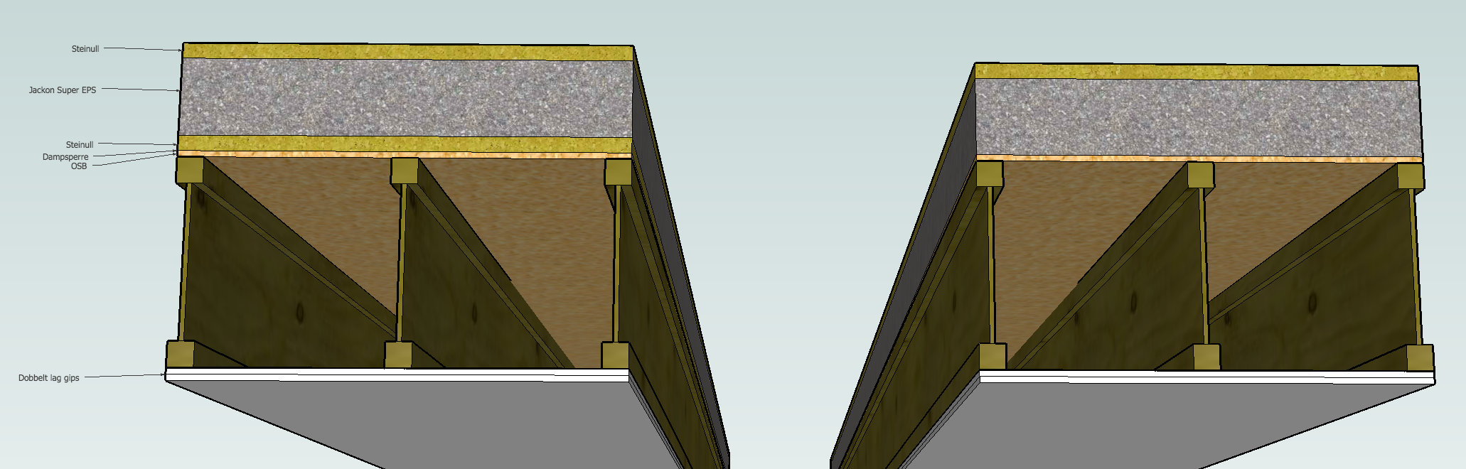 Vedlagt skisse viser mine 2 utkast, en med steinull over og under EPS, og en med kun over siden det allikevel er dobbel gips i tak i garasje.