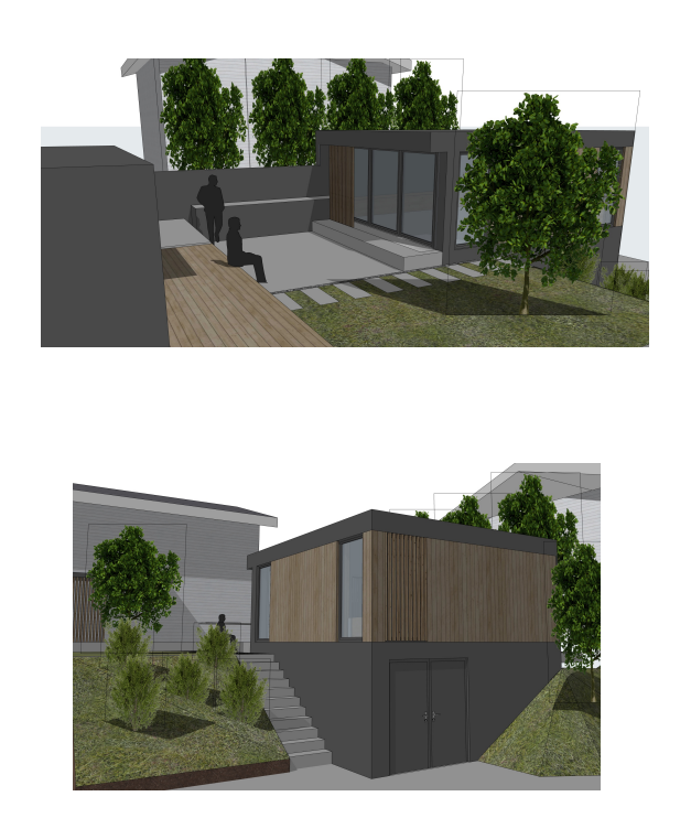 Har en bod som er bygget inn i skrånende terreng, så taket på boden flukter nesten med plenen på utsiden av huset.