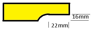 Tanken min var å bruke bordsaga til å skjære ut et rektangel på 16x22mm, og deretter frese buen fra kortsiden og la kulelager på fresen følge langsiden. Men å finne fres med stor nok radius ser ikke ut til å være så lett. Det største jeg har funnet har radius 18mm.
