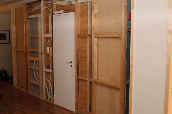 I huset vårt er desverre veggen med dør til bad/wc rett ved spiseplassen. Noe som ikke er spesielt hyggelig når noen må på do mens vi spiser. Spesielt ikke med gjester. Nå er det en veldig tynn dør der med luftesprekk under noe som gjør at all lyd går rett ut. Veggen hadde plater som ser ut som panel og noe glava som isolasjon, ikke spesielt lyddempende det heller. Veggen er ca 10 cm.