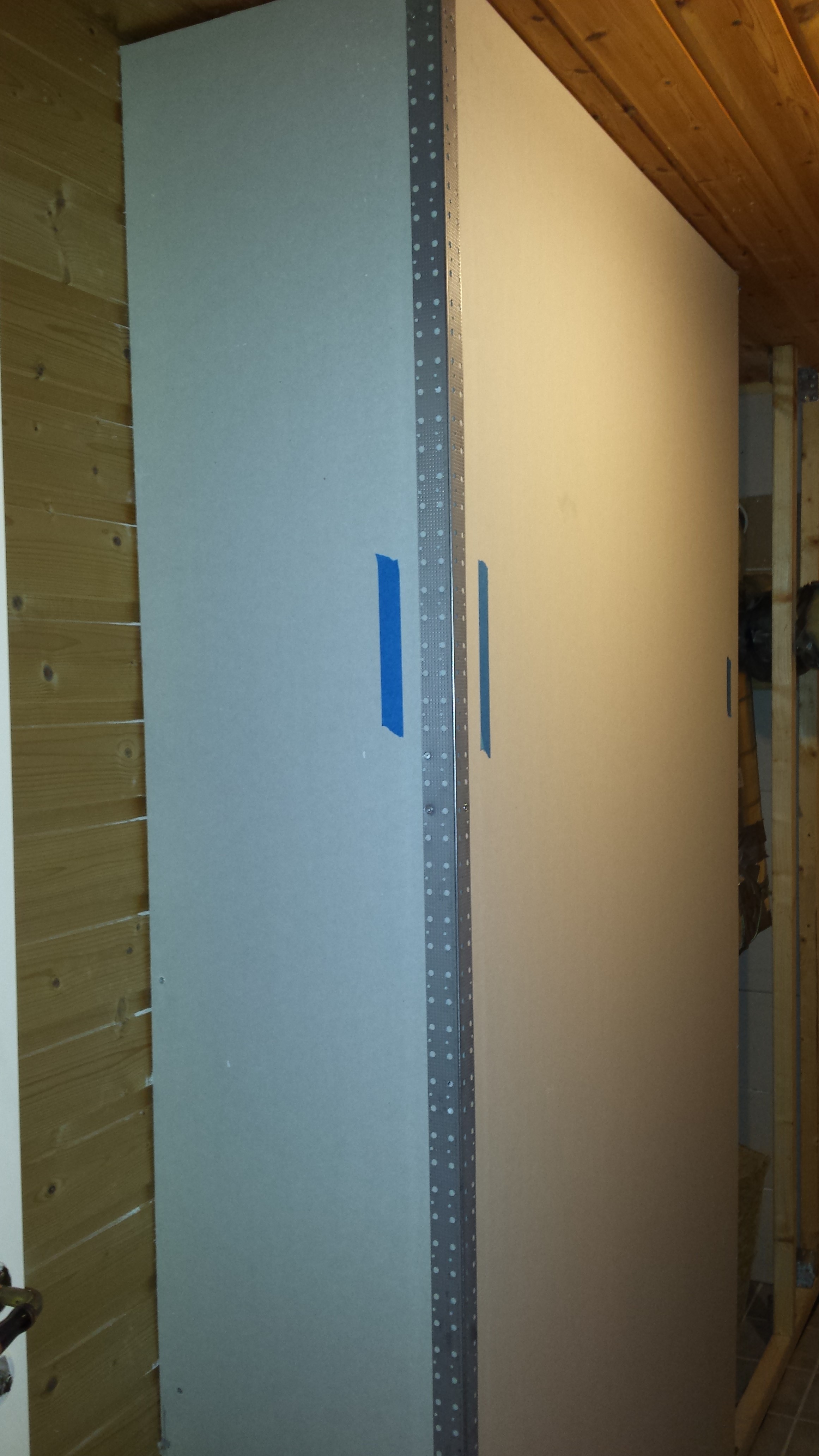 Så kommer spørsmålet: jeg har satt opp gipsen slik at "de forsenkede overgangene" som man skal sparkle og teipe i står mot hverandre. (I ettertid ser jeg at de forsenkede ovegangene skulle vært skjært vekk siden det da ikke ville være nødvendig å sparkle. Da hadde jeg fått plan gips plate mot plan gips plate ban. Menmen.. man lærer så lenge man lever).