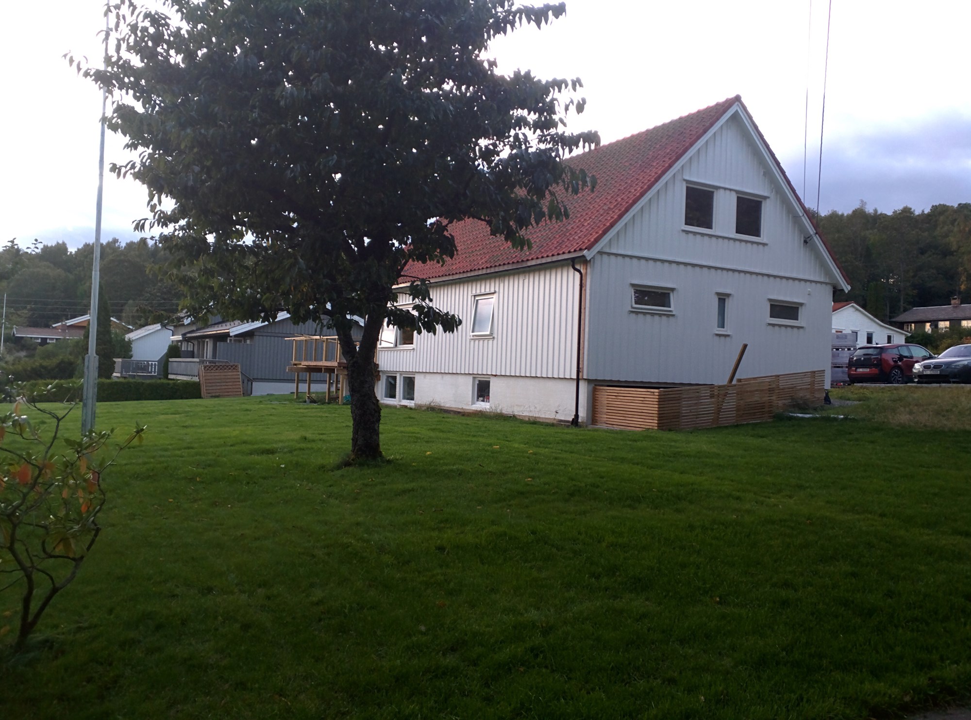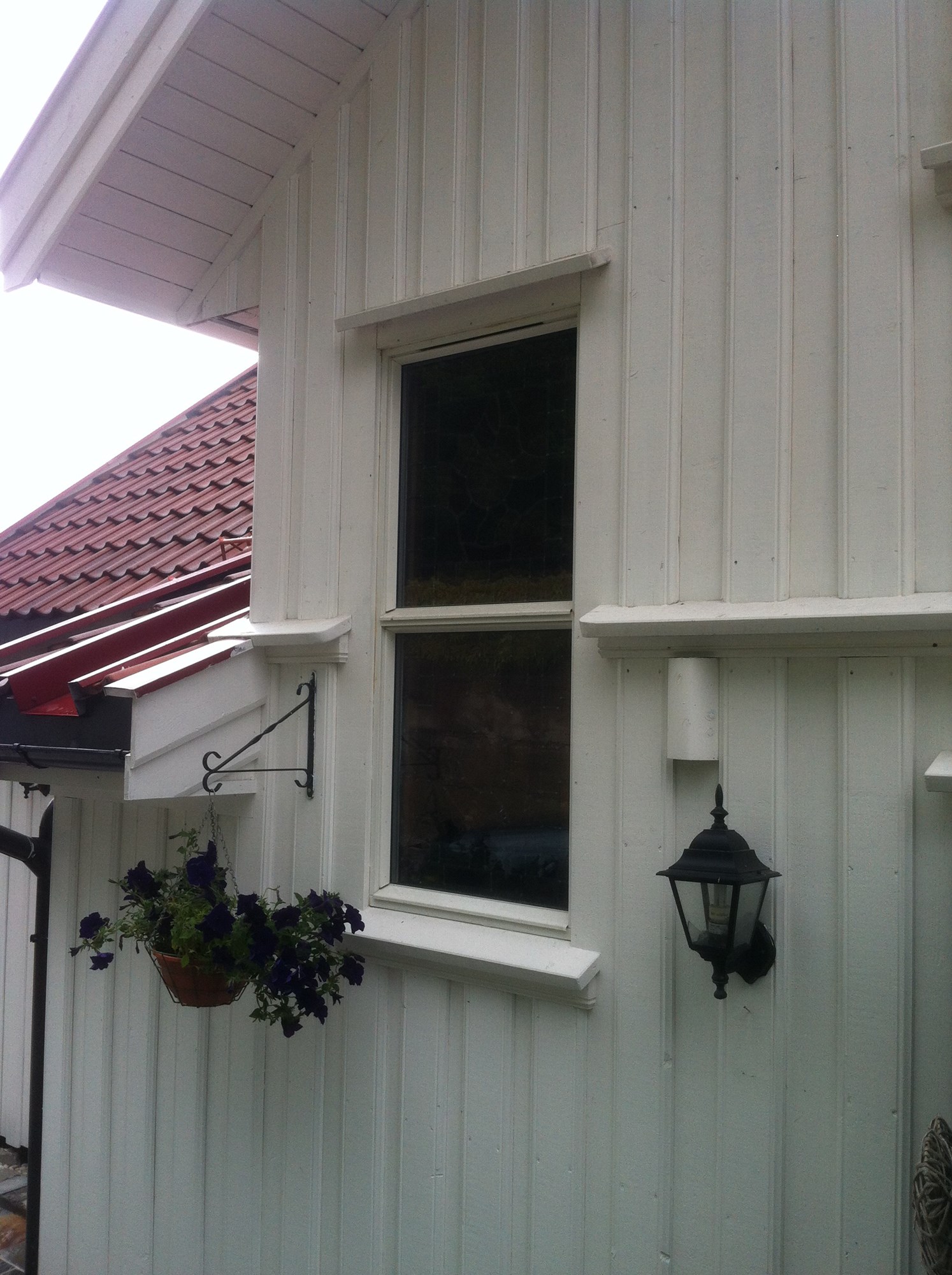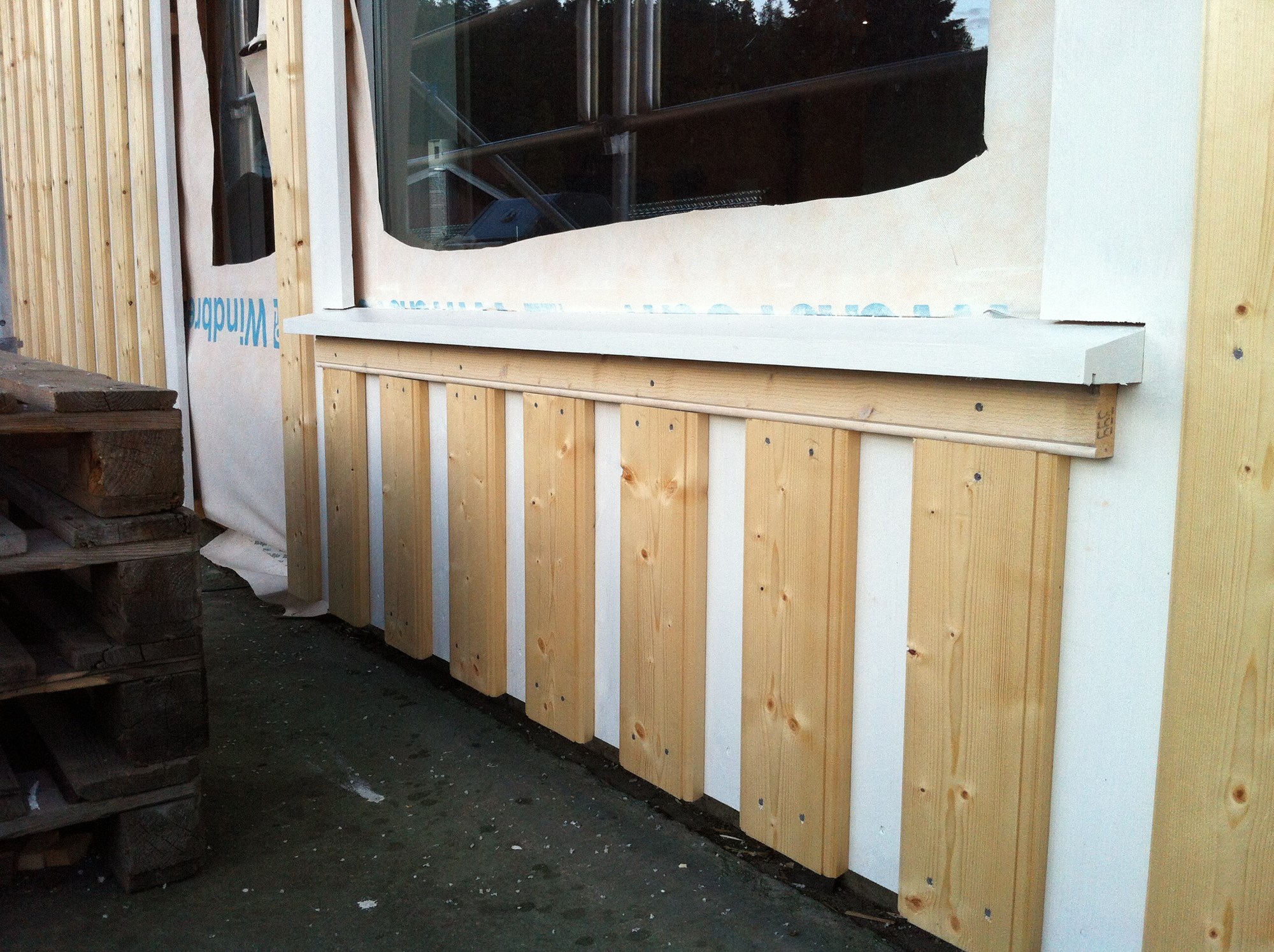 Ser slik ut på huset. (Ansvarlig for maling har ikke fått malt vannbrettet enda)(TTT)Fikk knekt til noen beslag med samme vinkel som vannbrettet som ligger 30mm ut på vannbrettet og går 40mm opp bak panelen.