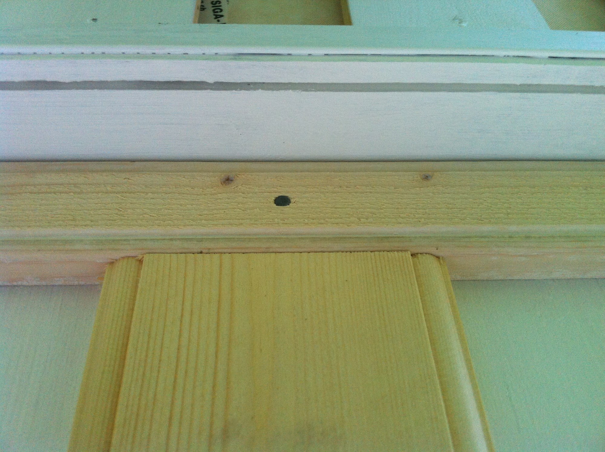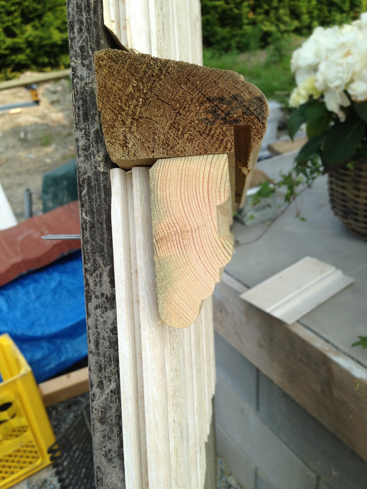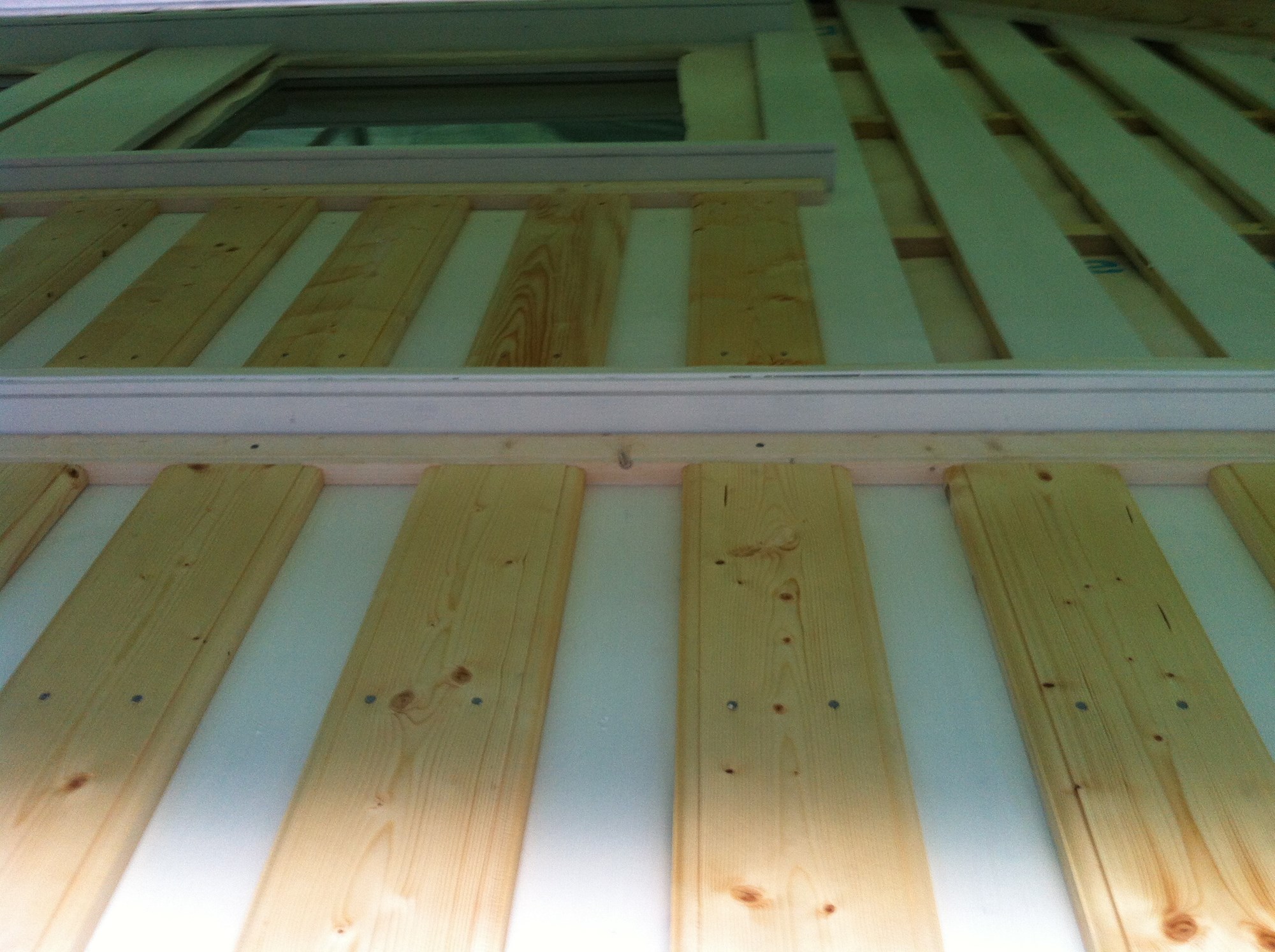 Ser slik ut på huset. (Ansvarlig for maling har ikke fått malt vannbrettet enda)(TTT)Fikk knekt til noen beslag med samme vinkel som vannbrettet som ligger 30mm ut på vannbrettet og går 40mm opp bak panelen.