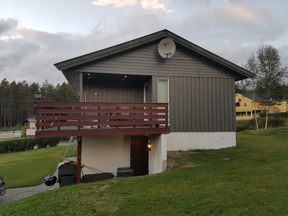 Sånn det er i dag er bjelkene festet fra innsiden av huset. Som dere ser på bildet er det også en støttemur der. Grunnen huset er bygd på er mye fjell/berg. (PS maling av hus pågår ;) )