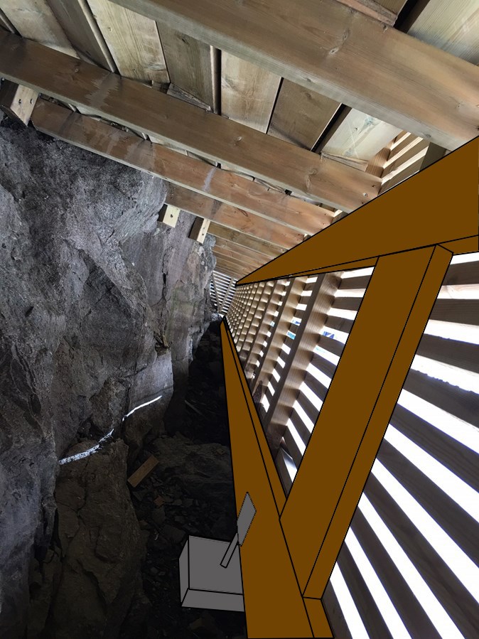 Her er 48x98 skrudd på siden av 48x148. Og deretter i topp av 48x98 og inn i fjell med nagler på kapp, og skruer fra 48x98 til kapp - ikke bekymret for festepunktene i fjell, men vektbelastning på vertikal 48x98 som kun har skruer som bæring.