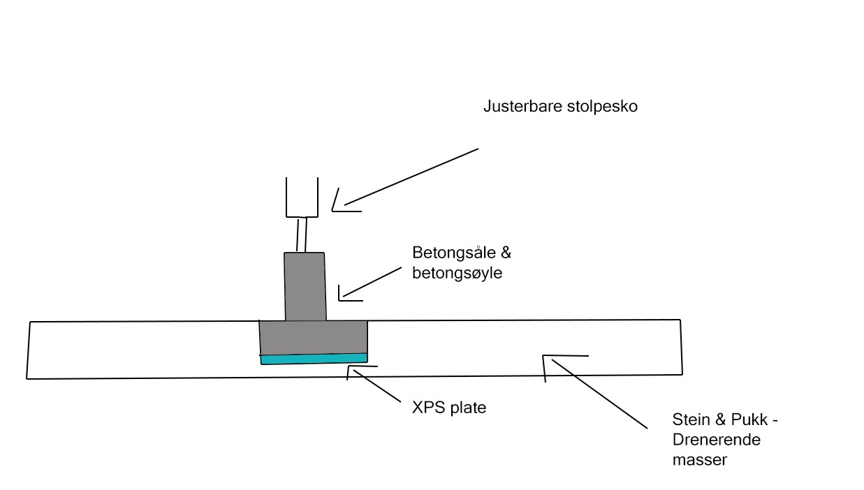 Tror jeg skjønner hva du mener nå, de søyleskoene som per i dag er på plattingen har ikke noe med selve synkingen av bed tror jeg. Siden 2.6 som er på enden av alle disse 2.6 som har søylesko har sunket ned, altså skruene klarer ikke vekten fra bed.