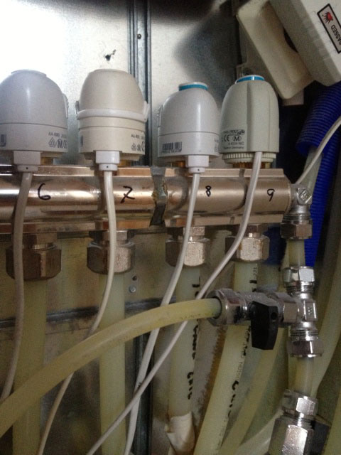 Bildet med grå "kopper" med ledning er ventilmotorer som styres av termostater i de enkelte rom/sløyfer. Når termostaten kaller på varme, så slipper ventilen på mer varmt vann.