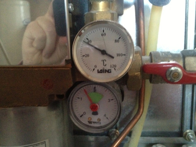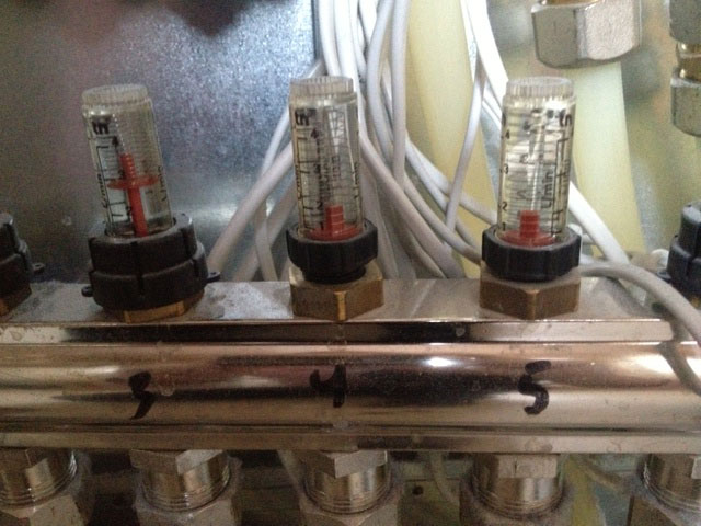 Tipper at du har luft i to av sløyfene eller at termostaten er satt for lavt. De røde "korkene" er strømningsmålere. To av kursene er "døde".