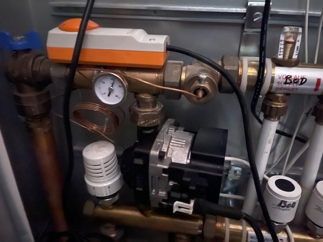 Det mangler noe som justere temperatur fra kjele og inn i annlegg. Denne er mekanisk (hvitt ratt til venstre?)
