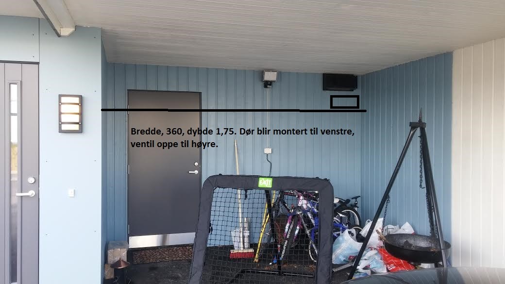 Jeg har planer om å dele av carporten, slik at jeg får en bod som er ca 3,6m bred, og med en dybde på 1,75 cm. Planen er å montere dør på venstre side av denne veggen, samt en ventil oppe til høyre. Som dere ser av bildet er det idag montert en kombiboks for ventilasjon på eksisterende vegg. Denne har både ut/innluft.