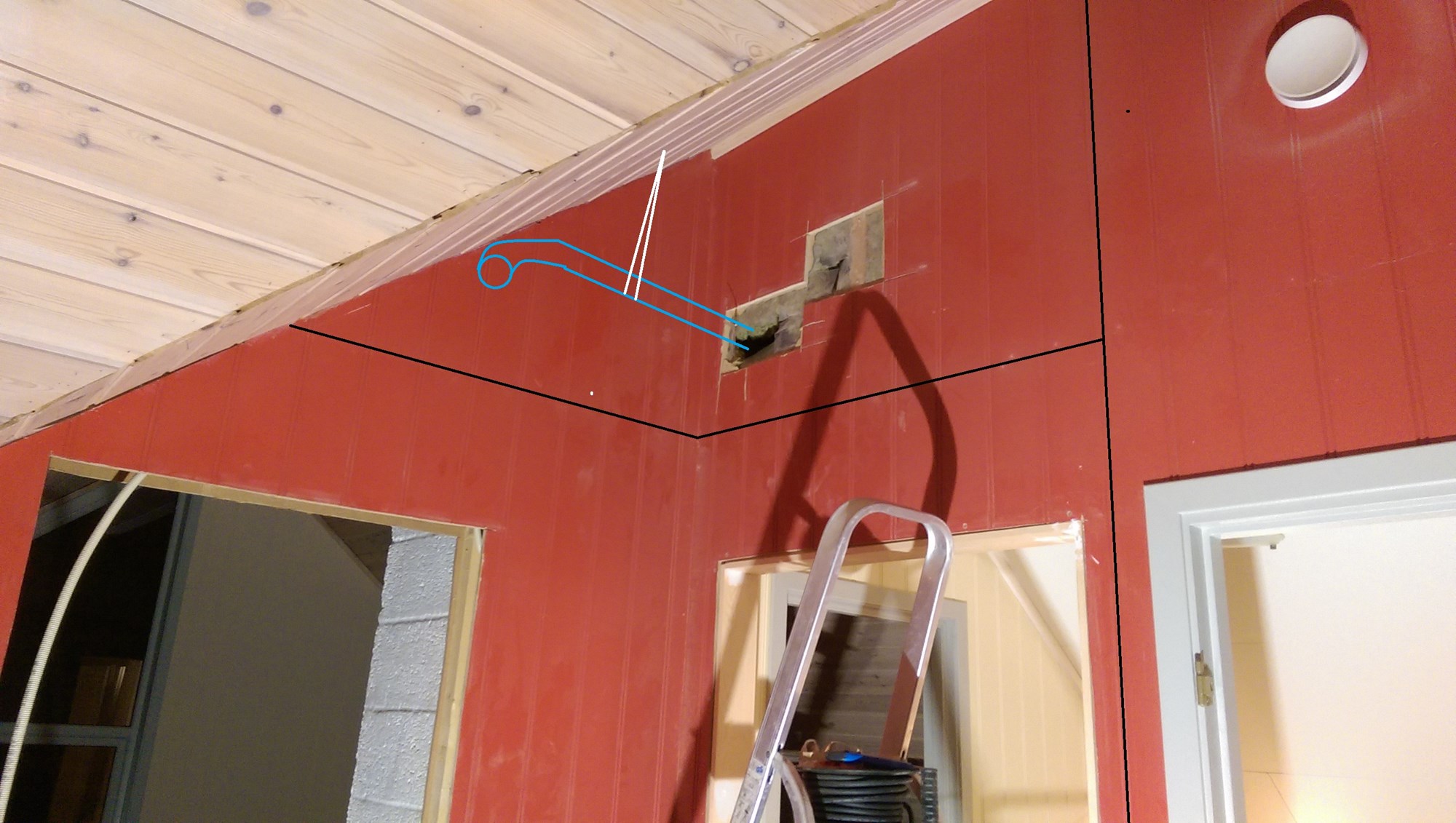 Jeg har lite erfaring med dette så jeg trenger litt råd. Jeg har som bildene viser sagd et par små hull i veggen for å se hvor rørene går. Som det første bildet viser er det ikke så mye plass mellom bend til høyre, og vegg til venstre, ca 15 - 20 cm. Kan jeg sette på et påstikk her, og så sette inn rør som vist på nederste bilde? Er det noe spesielt jeg bør være obs på her? De svarte strekene viser kun hvor vegg og tak skal gå.