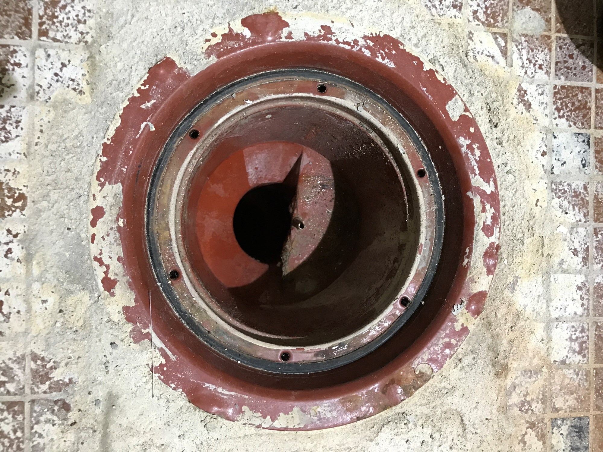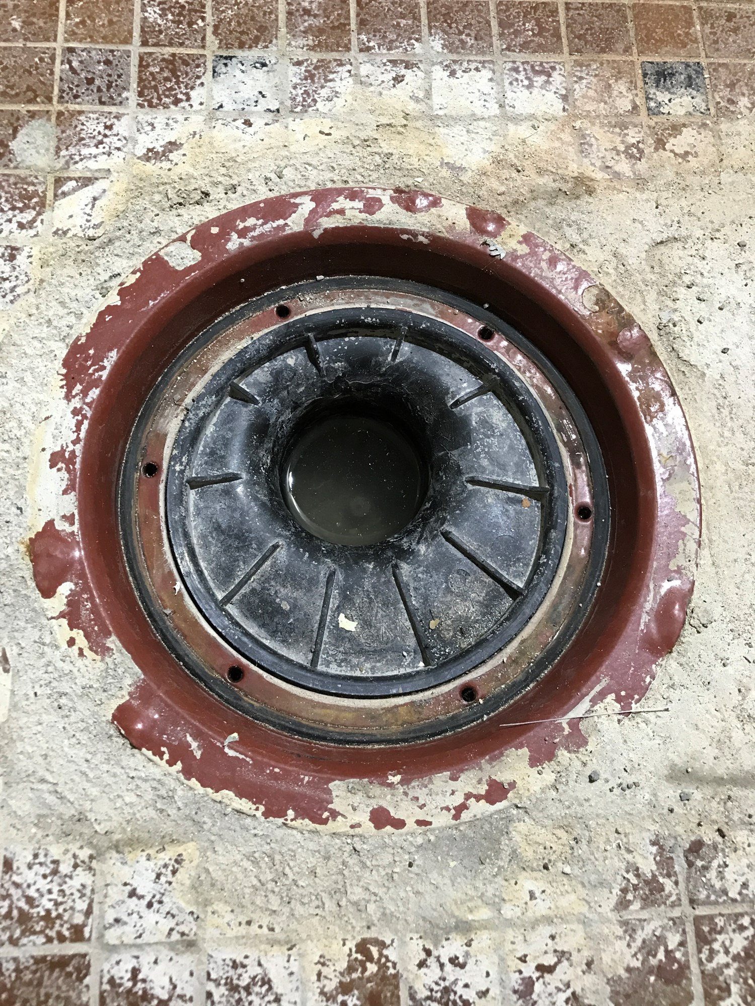 Hovedsluket (som ble satt inn ifm. renoveringen i 2000) er støpt ned i flush med det gamle orignale flisgulvet og er av typen "Joti" med klemring. Dette ser helt fint og intakt ut spør du meg...