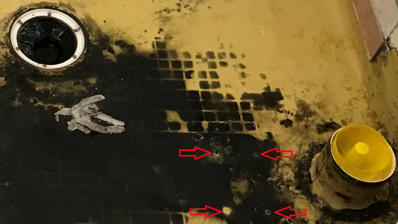 Generel vond (mugg-)lukt, og fuktig betong er vel hovedsakelig det jeg har merket meg... Men det var ganske synlig på membranen - i form av missfaring av duken (svarte flekker) så dette er sikkert et resultat av surt vann og kjemikaler/såpe som har samlet seg opp og blitt liggende å godgjøre seg over tid. Membranen i seg selv ellers var fin og tett, sett bort i fra hullene til WC