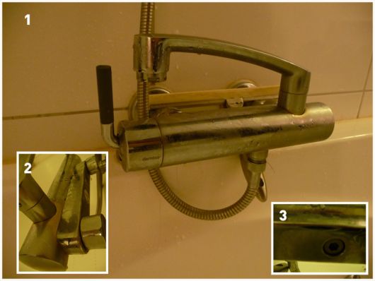 Det drypper stadig litt fra dusjhodet selv om kranen er ordentlig stengt. Jeg vet ikke helt hva det kalles men det er en armatur med to "uttak" - den har et dusjhode samt en "arm" som man vipper ut i rommet for å tappe vann i selve badekaret. Kranen er av merket Damixa.