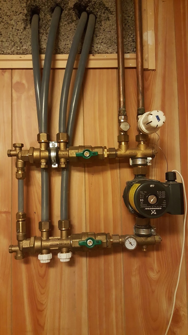 TS har allerede forklart at dette systemet mest sannsynlig er tilknytt sentralvarmeanlegget til radiatorne. Sentralvarmeanlegget har naturligvis en egen sirkulasjonspumpe, slik at det er overtrykk inn mot termostatventilen. Den gule sirkulasjonspumpen ved samlestokken på bildet sørger for sirkulasjon i gulvvarmekursene.