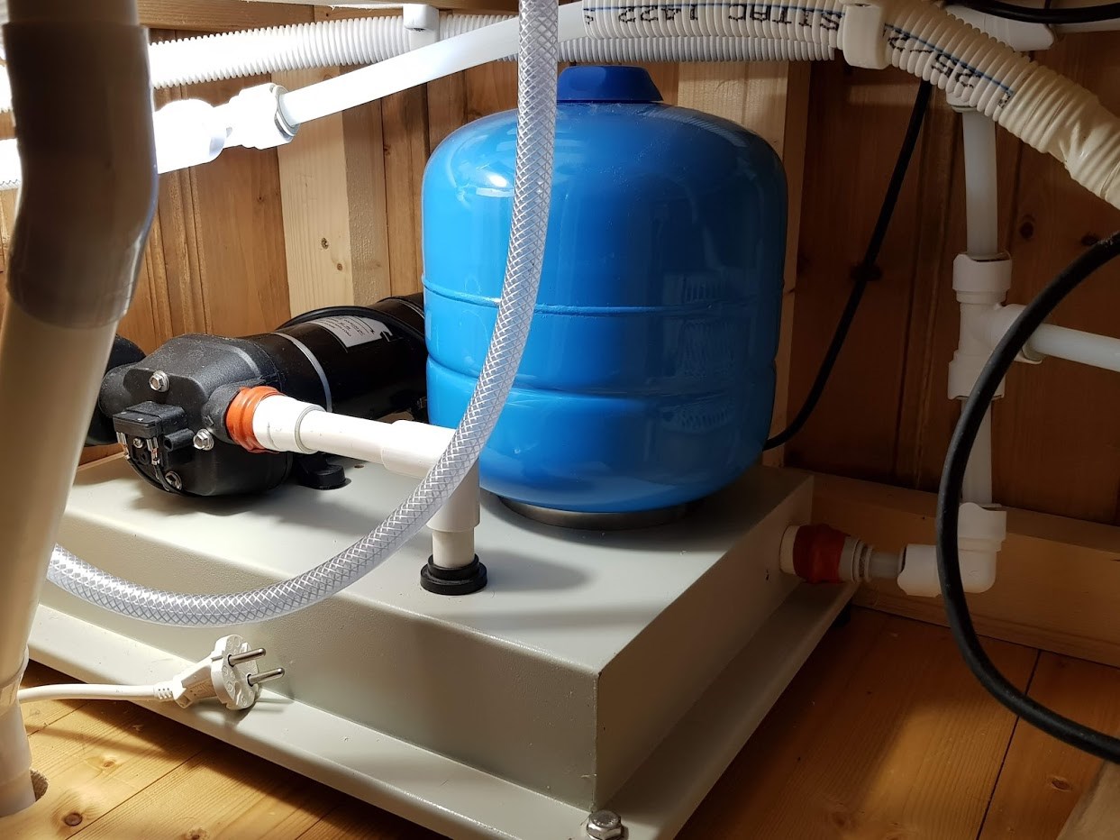 I vårt "ikke innlagt vann"-opplegg på hytta har vi en 250 liters vanndunk (som vi bærer inn vann fra brønn og fyller) og en pumpe fra denne som gir trykkvann i en vask og i et dusjkabinett.