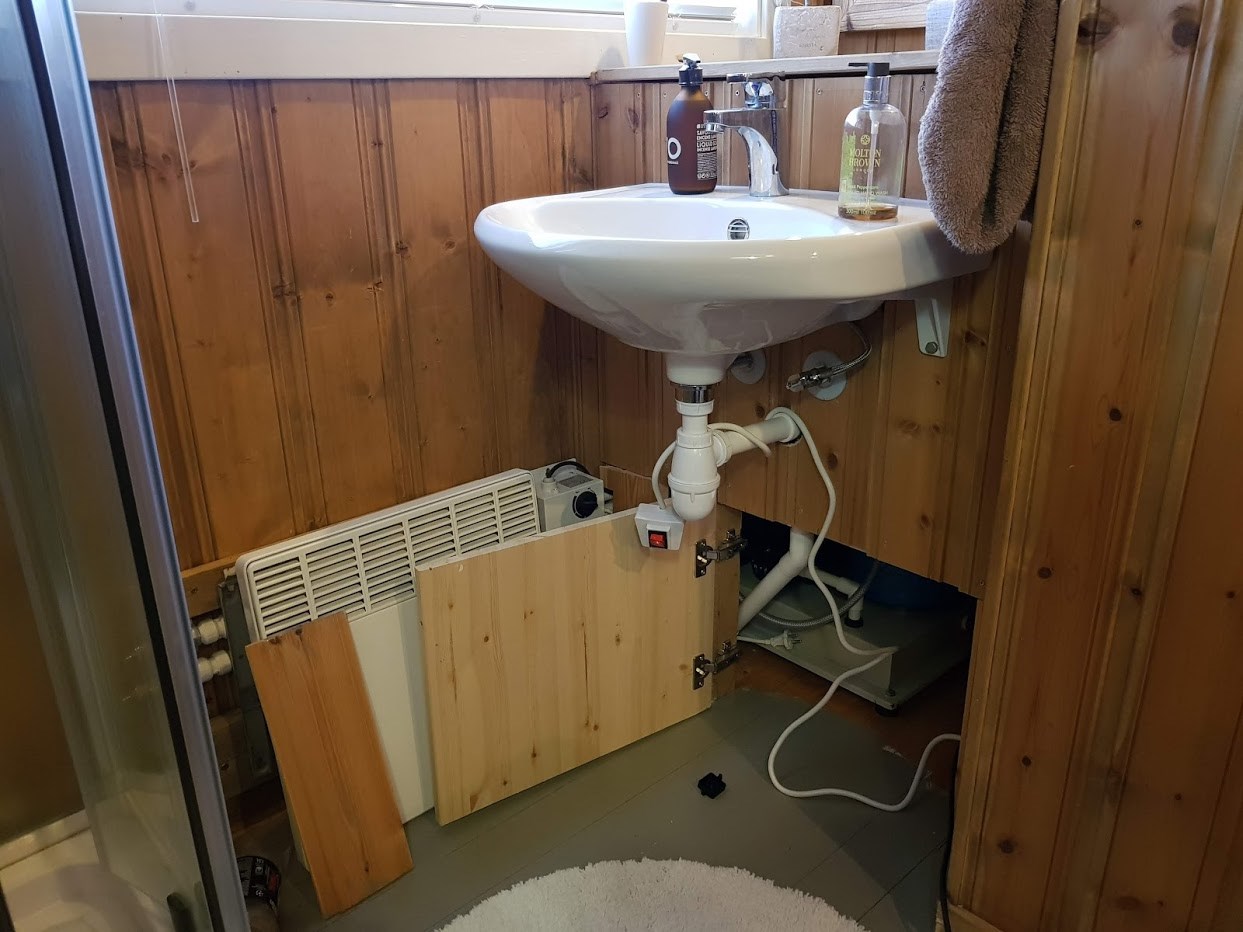 Bare så det er nevnt, med dette oppsettet går du nok under definisjonen "innlagt vann" med tilhørende krav om renseanlegg. Problemet er størrelsen på tanken inne, de er typisk begrenset til 25-40 liter om man skal ha "ikke innlagt vann". Så det er lite poeng i å være vannet inn, du kan like så godt pumpe det inn i tanken. Like lovlig/ulovlig som dagens oppsett.