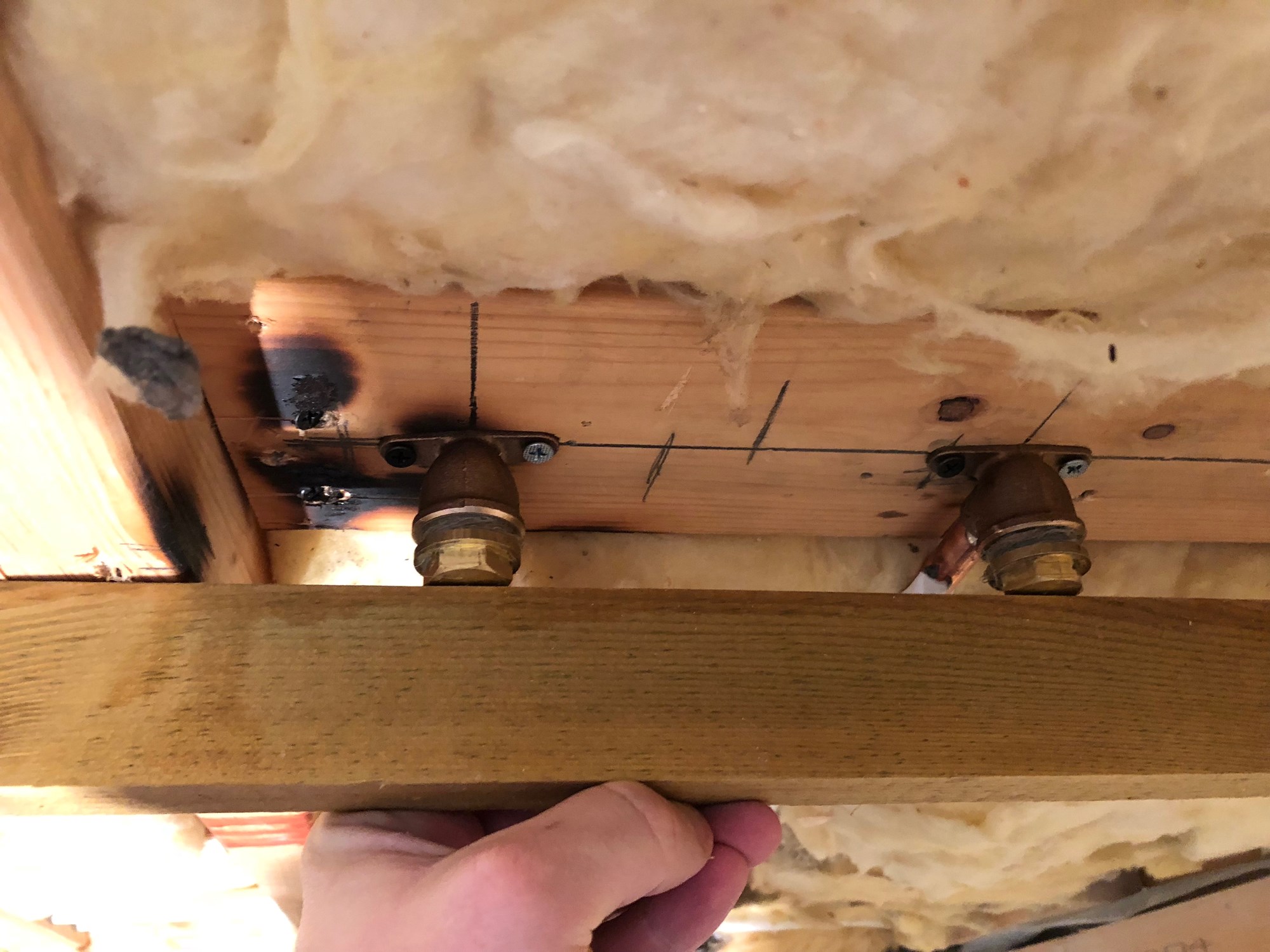 Det finnes ikke noen god løsning for dette annet enn hva som er utført. Å flytte de lenger ut skaper bare problemer med montering av dusjbatteriet. Er det lagt nye kobberrør rundt i hele badet i veggen, er ikke dette i brudd på regelverket i dag. Er det eksiterende rør, med noe justeringer er det greit. Men merk at disse rørene har en svært begrenset levetid (15-30 år)